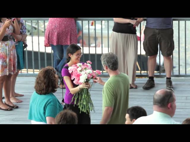 Когда возлюбленные пришли к местному Центру современного искусства, людей дарящих ошеломленной Терезе цветы стало намного больше, и скромный букет из нежно-розовых и белых цветов вскоре превратился в охапку.