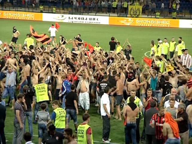 Сразу же после завершения встречи "Шахтера" и "Черноморца" на поле ОСК "Металлист" прорвались болельщики команд. Около тысячи фанов донецкого гранда попали на газон со стороны Северной трибуны, а со стороны Южной сумели просочиться около 300 болельщиков "Черноморца". Остальных желающих попасть на поле сдержали стюарты.