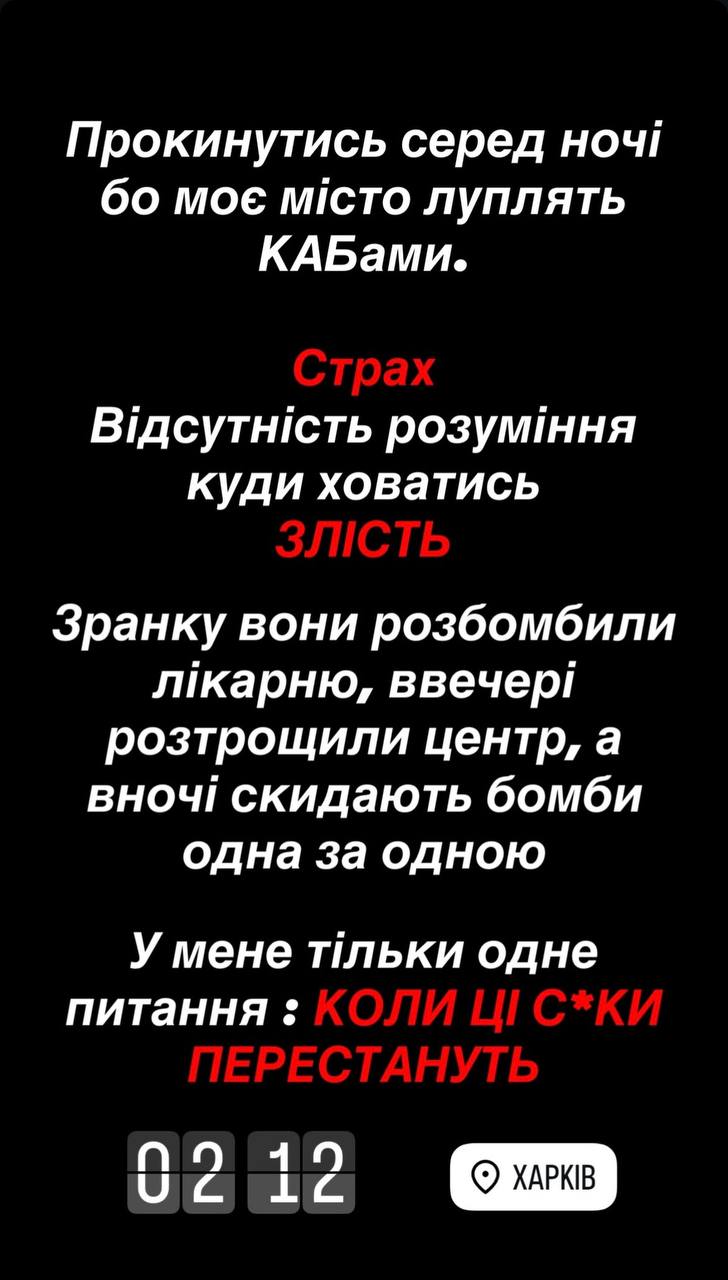 Белень уточнила, что живет в постоянном страхе из-за российских обстрелов. В соцсетях, она эмоционально отреагировала на прилет, опубликовав сторис: "Проснуться среди ночи, потому что мой город лупят КАБами. Страх. Отсутствие понимания, куда прятаться. Злость. Утром они разбомбили больницу, вечером разбили центр, а ночью сбрасывают бомбы одна за другой. У меня только один вопрос: когда эти с*ки прекратят".