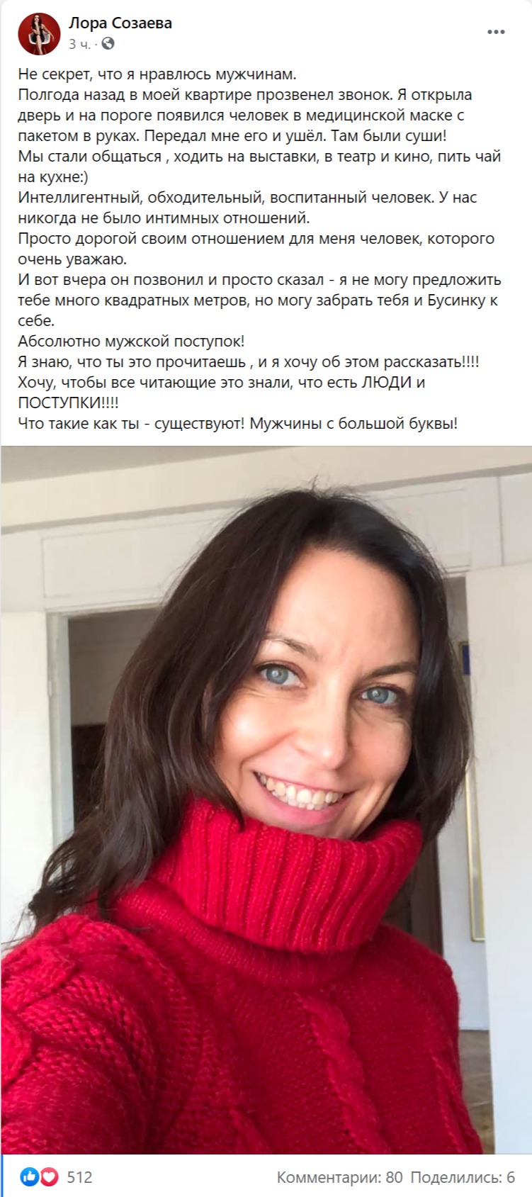 - Не секрет, что я нравлюсь мужчинам. Полгода назад в моей квартире прозвенел звонок. Я открыла дверь и на пороге появился человек в медицинской маске с пакетом в руках. Передал мне его и ушёл. Там были суши! Мы стали общаться, ходить на выставки, в театр и кино, пить чай на кухне: интеллигентный, обходительный, воспитанный человек. У нас никогда не было интимных отношений. Просто дорогой своим отношением для меня человек, которого очень уважаю. И вот вчера он позвонил и просто сказал - я не могу предложить тебе много квадратных метров, но могу забрать тебя и Бусинку к себе. Абсолютно мужской поступок! Я знаю, что ты это прочитаешь, и я хочу об этом рассказать! Хочу, чтобы все читающие это знали, что есть ЛЮДИ и ПОСТУПКИ! Что такие как ты - существуют! Мужчины с большой буквы, - рассказала Лора.