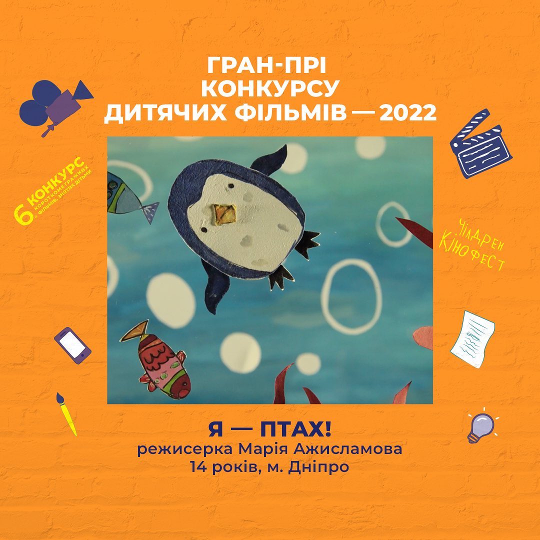 Лучший украинский детский фильм – анимационная работа «Я – птица!» 14-летней Марии Ажислаповой из Днепра – о пингвинчике, который решил, что его мама чайка, а потому смог взлететь (награда 15 000 грн).