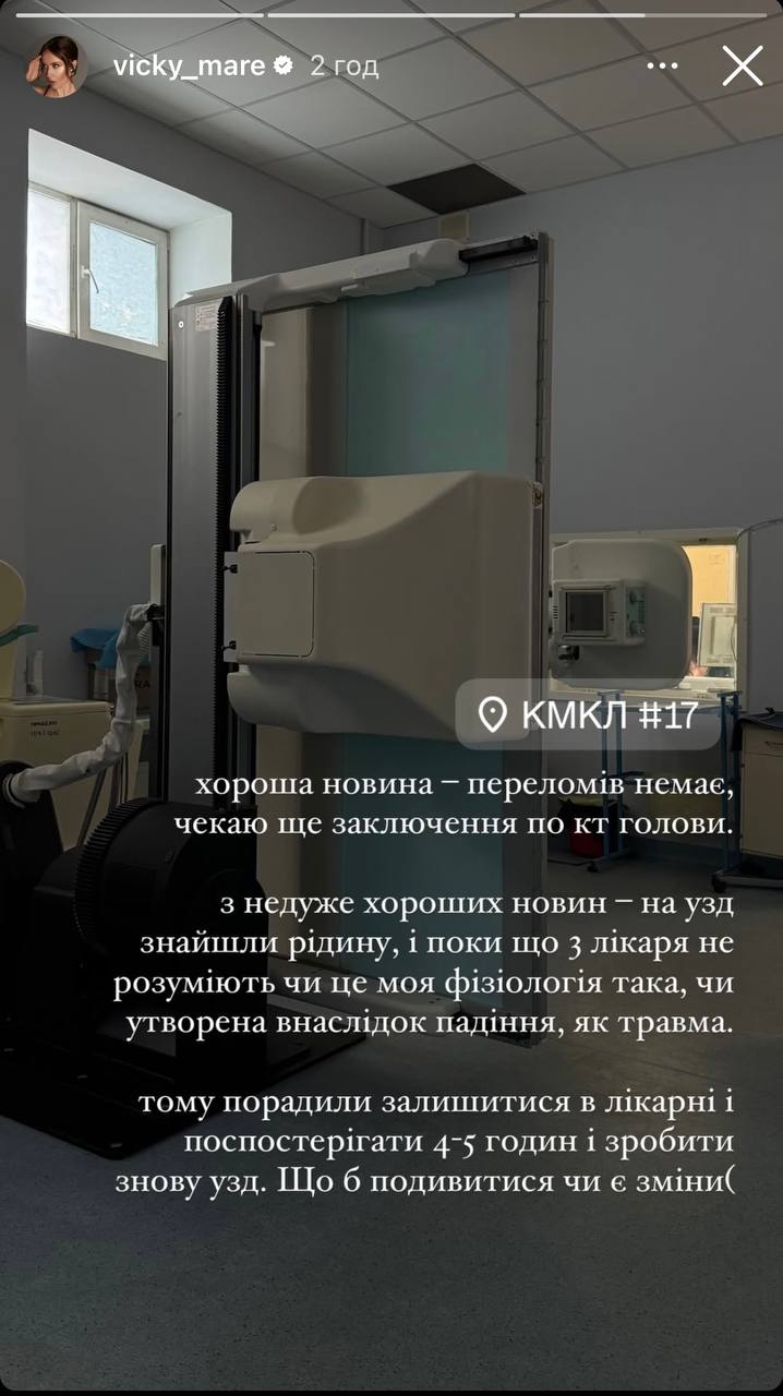 В сторис девушка рассказала, что медики укололи ей обезболивающее и отвезли в больницу, где сделали рентген и осмотрели травмы. К счастью, врачи не обнаружили переломов, однако Виктория все еще ждет результатов компьютерной томографии головы. Врачи на УЗИ выявили у нее жидкость и пока проводят дополнительные обследования.