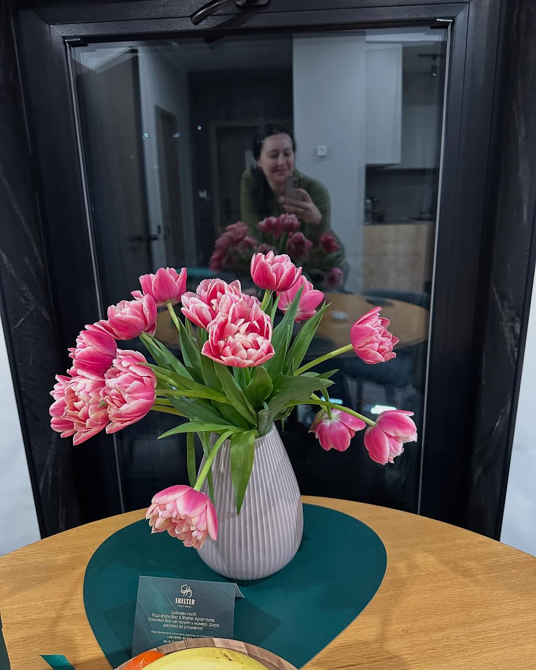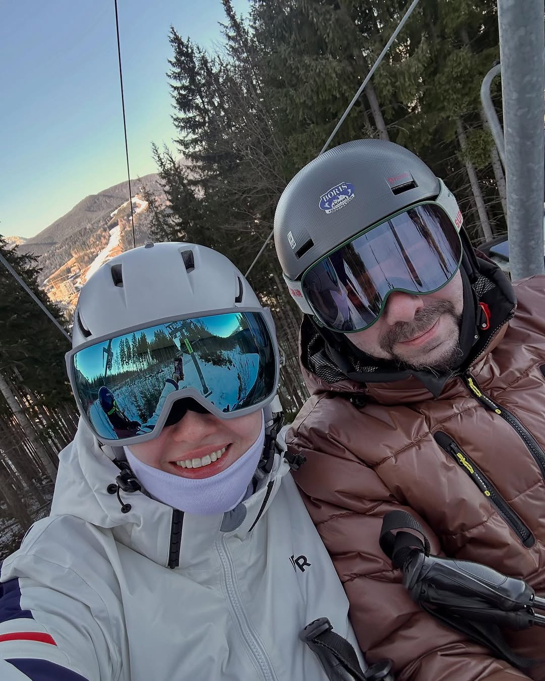 В первый день отпуска пара, надев снаряжение, покаталась на лыжах и сделала романтическое селфи на подъемнике и у зеркала.