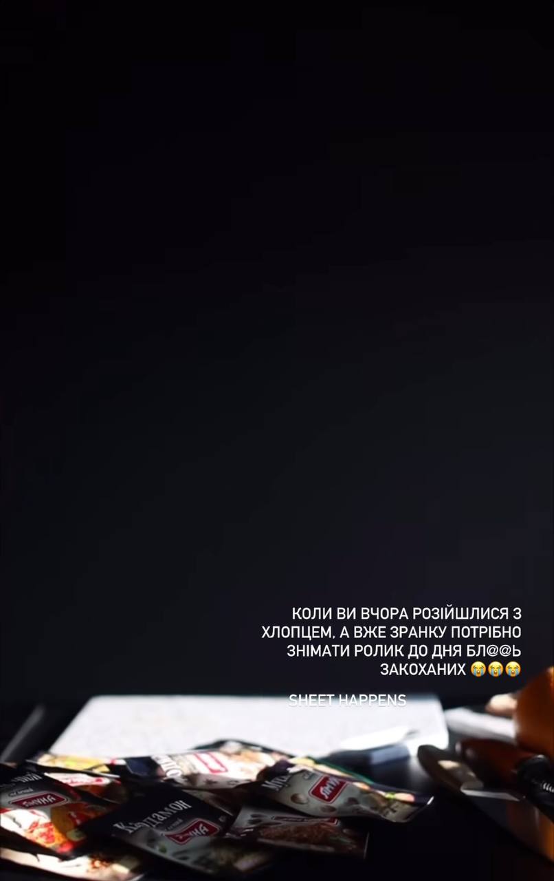 - Когда вы вчера разошлись с парнем, а уже утром нужно снимать ролик ко Дню, бл*ть, влюбленных. Г*вно случается, - уточнила Ольга.
