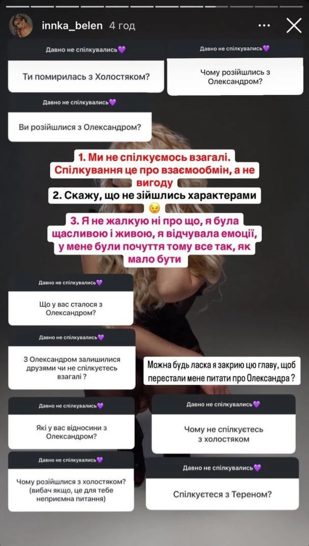 Ранее ни Белень, ни Терен не называли причину расставания. Пара подтвердила разрыв отношений спустя месяц после выхода в эфире финала проекта. Cлухи о том, что возлюбленные не вместе появились после их публичной ссоры из-за языкового вопроса. Ранее в интервью со Славой Деминым Инна призналась, что не очень понимает людей, которые "гонят на русскоязычных", добавив, что "топит за харьковчан", даже если те до сих пор общаются на русском. Она также подчеркнула, что ее не цепляет языковой вопрос, и призвала быть более человечными к тем, кто, живя под обстрелами, старается говорить на украинском. "Терен" заявил, что такая позиция девушки "стала для него открытием".