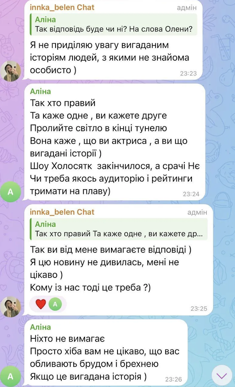 15 апреля Елена Мандзюк в интервью Алине Доротюк заявила, что у "Терена" и Белень не было отношений в реальной жизни. По словам Елены, она проводила с Александром больше времени, чем Инна.