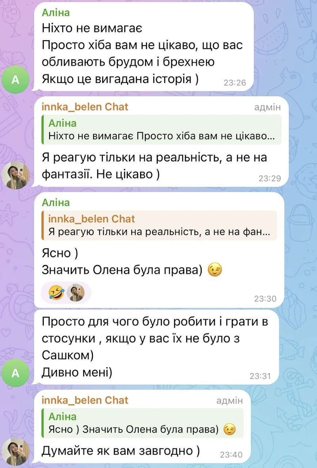 – Я не уделяю внимание вымышленным историям людей, с которыми я не знакома лично. Я реагирую только на реальность, не на фантазии. Не интересно, - написала Белень в комментариях под сообщением в своем телеграм-канале.