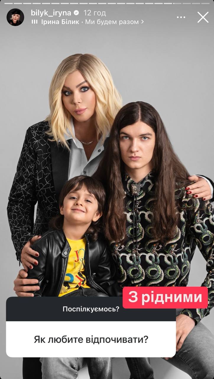 Певица Ирина Билык в соцсетях показала редкие снимок с двумя сыновьями. Отвечая на вопросы подписчиков в соцсетях артистка призналась, что любит отдыхать в кругу родных, выложив в сторис кадр в компании своих детей - 25-летним Глебом и 9-летним Табризом.