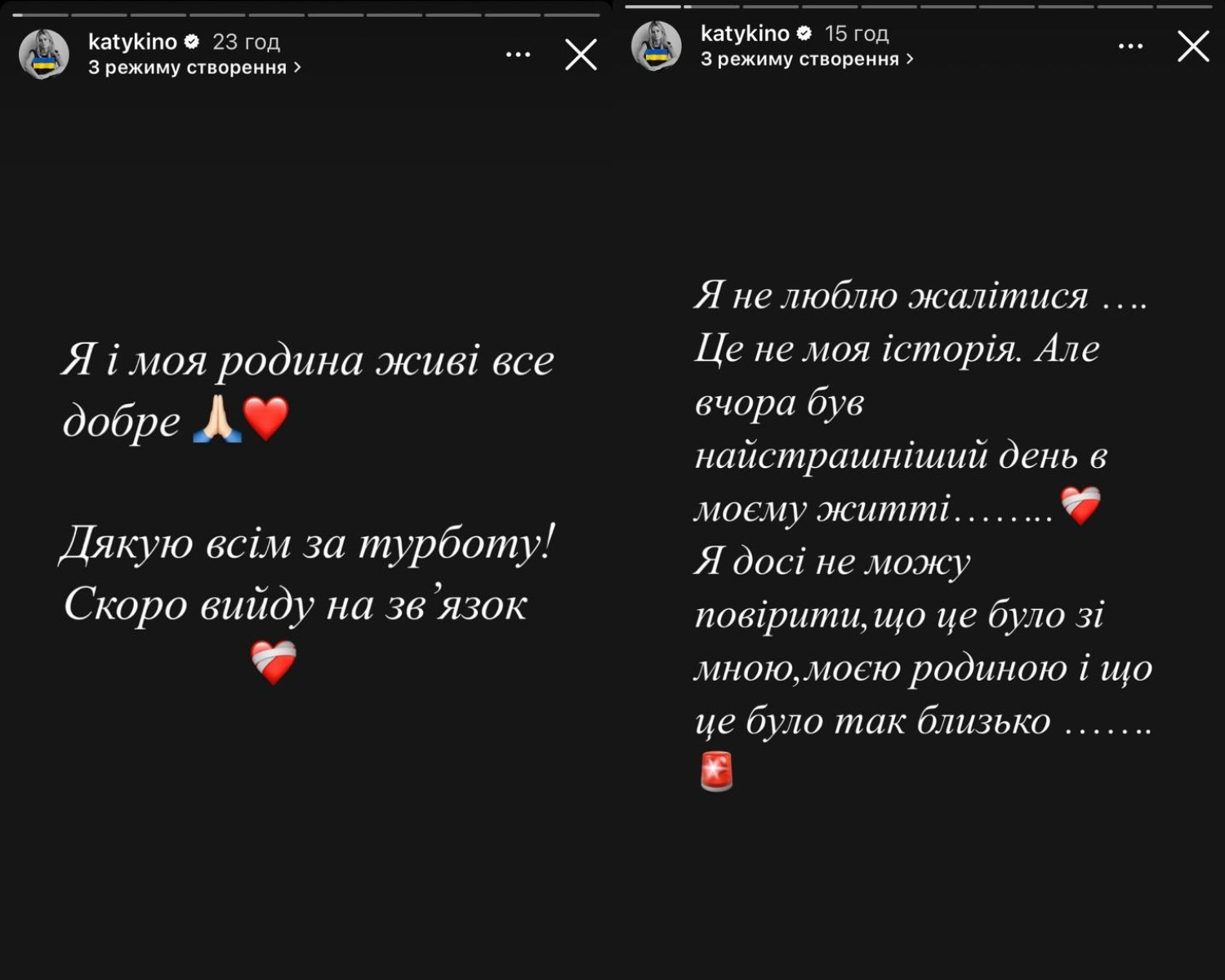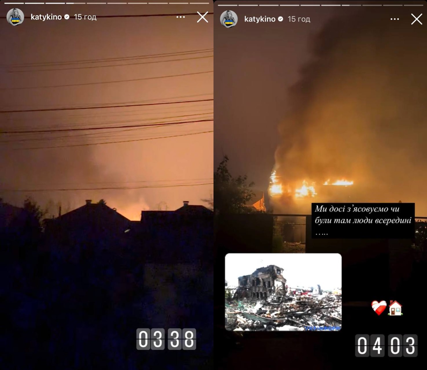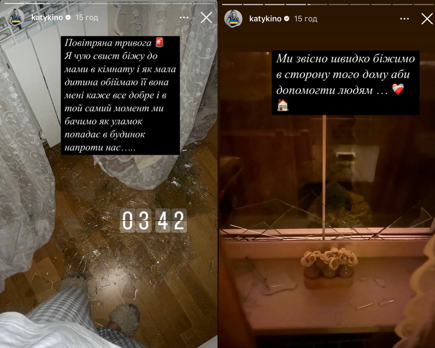 Кузнецова рассказала, что во время воздушной тревоги она услышала громкий свист за окном, поэтому сразу побежала в комнату к маме, которая начала ее успокаивать. А спустя несколько секунд они увидели, что в дом соседей попал осколок. Артистка и ее родные сразу побежали к жилищу, чтобы помочь пострадавшим. В соцсетях Екатерина показала последствия разрушений и пламя, охватившее дом.