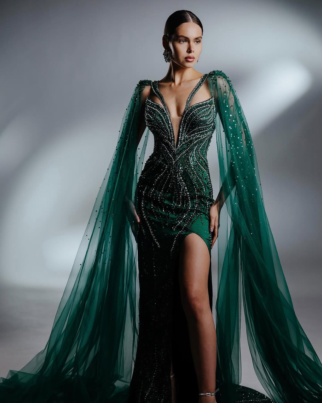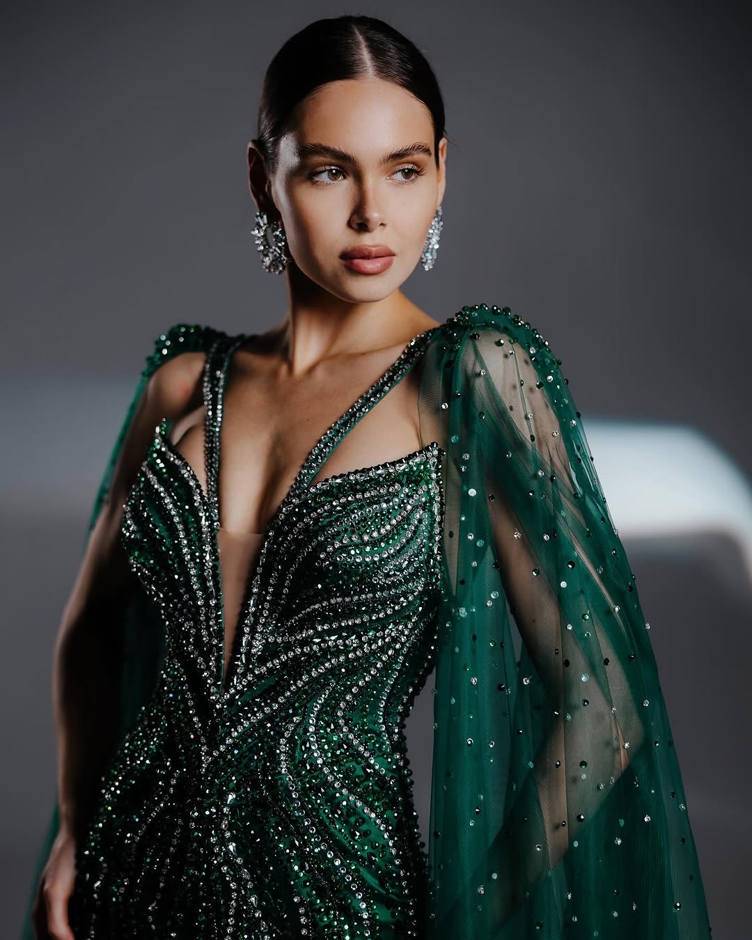 Изумрудный оттенок наряда напоминает о величии Карпатских лесов. Отделка серебряными и зелеными камнями создает эффект мерцания росы на рассвете - символа чистоты, внутреннего света и гармонии с окружающим миром. Прозрачные шифоновые рукава, легкие, как туман над рекой, создают ощущение, будто сам воздух танцует вместе с обладательницей платья.