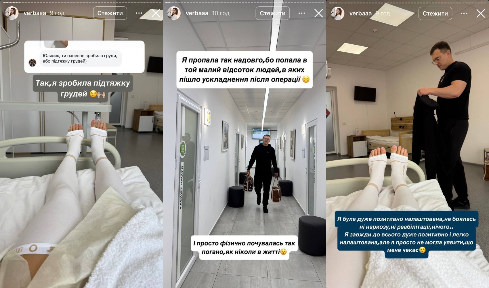 Инстаблогер из Ивано-Франковска Юля "Верба" Вербинец сделала пластическую операцию на груди. Девушка легла под нож, чтобы уменьшить бюст, который увеличился во время беременности и грудного вскармливания. По словам Юли, в тот период ей даже было тяжело ходить, поскольку была большая нагрузка на позвоночник. Верба решилась на хирургическое вмешательство после того, как прекратила кормить дочь грудью. Блогер подчеркнула, что в тот период ее грудь начала уменьшаться и сильно обвисать.