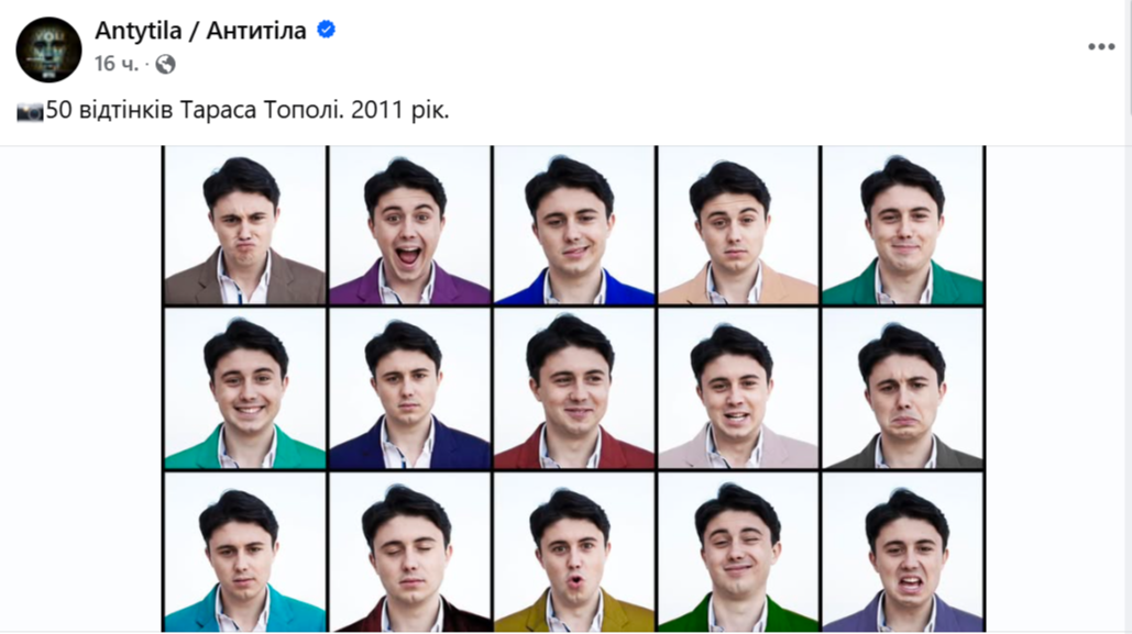 Лидер группы "Антитіла" Тарас Тополя показал, как выглядел около 15 лет назад. В Facebook артист опубликовал коллаж из своих фото, на которых запечатлен с одного ракурса в пиджаках разного цвета и с густой шевелюрой. По словам музыканта, эти снимки были сделаны в 2011 году.