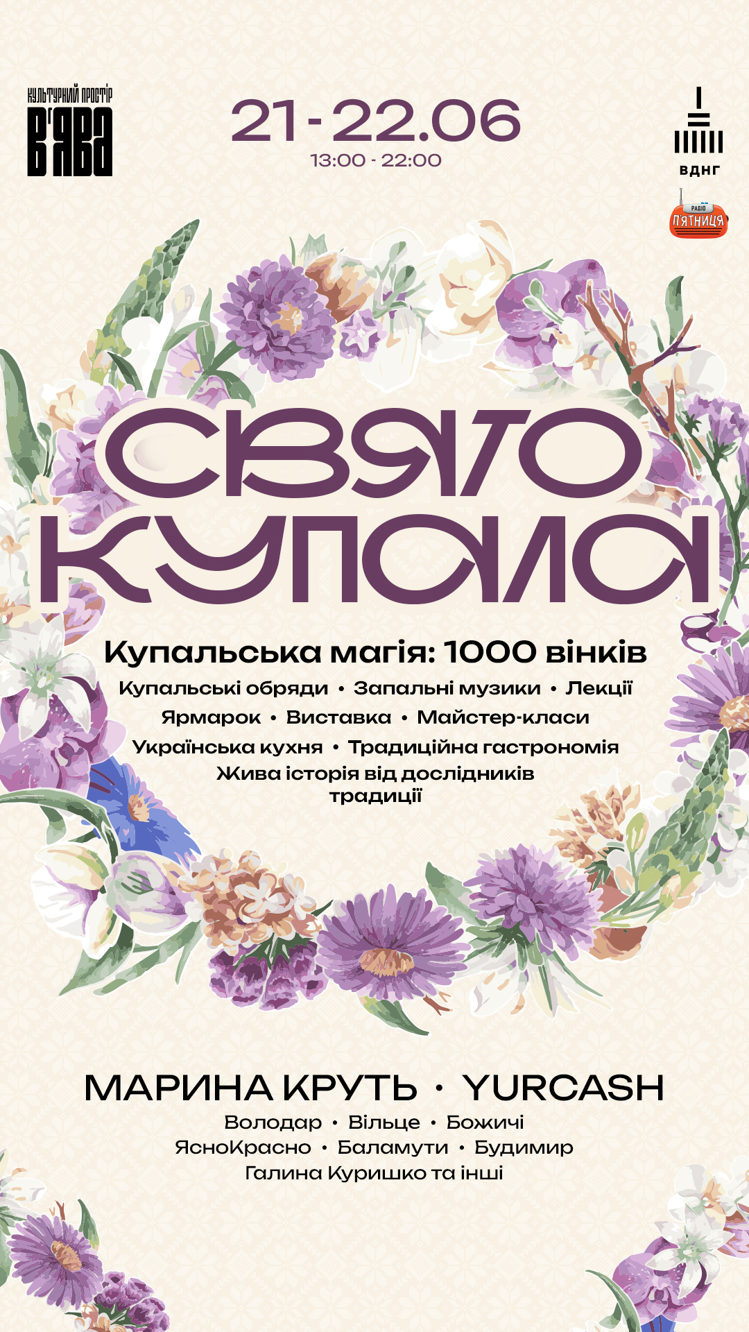 В культурном пространстве «В’ЯВА» 21 и 22 июня будут праздновать Ивана Купала. В программе фестиваля будут лекции, мастер-классы, обряды и выступления фольклорных групп со всей страны. Хедлайнерами фестиваля станут Yurcash и Марина Круть.