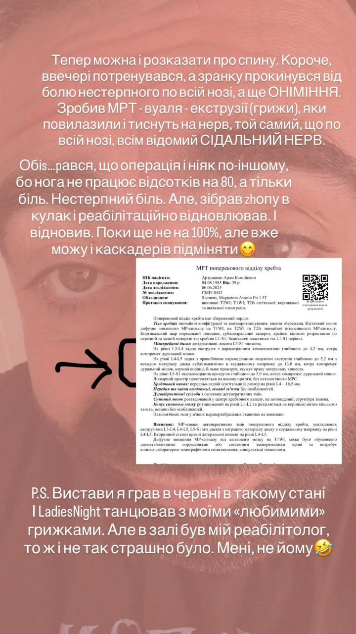 - Теперь можно и рассказать о спине. Короче, вечером потренировался, а утром проснулся от боли невыносимой по всей ноге, а еще онемение. Сделал МРТ - вуаля - экструзии (грыжи), которые повылазили и давят на нерв, тот самый, что по всей ноге, всем известный седалищный нерв, - отметил артист в соцсетях.