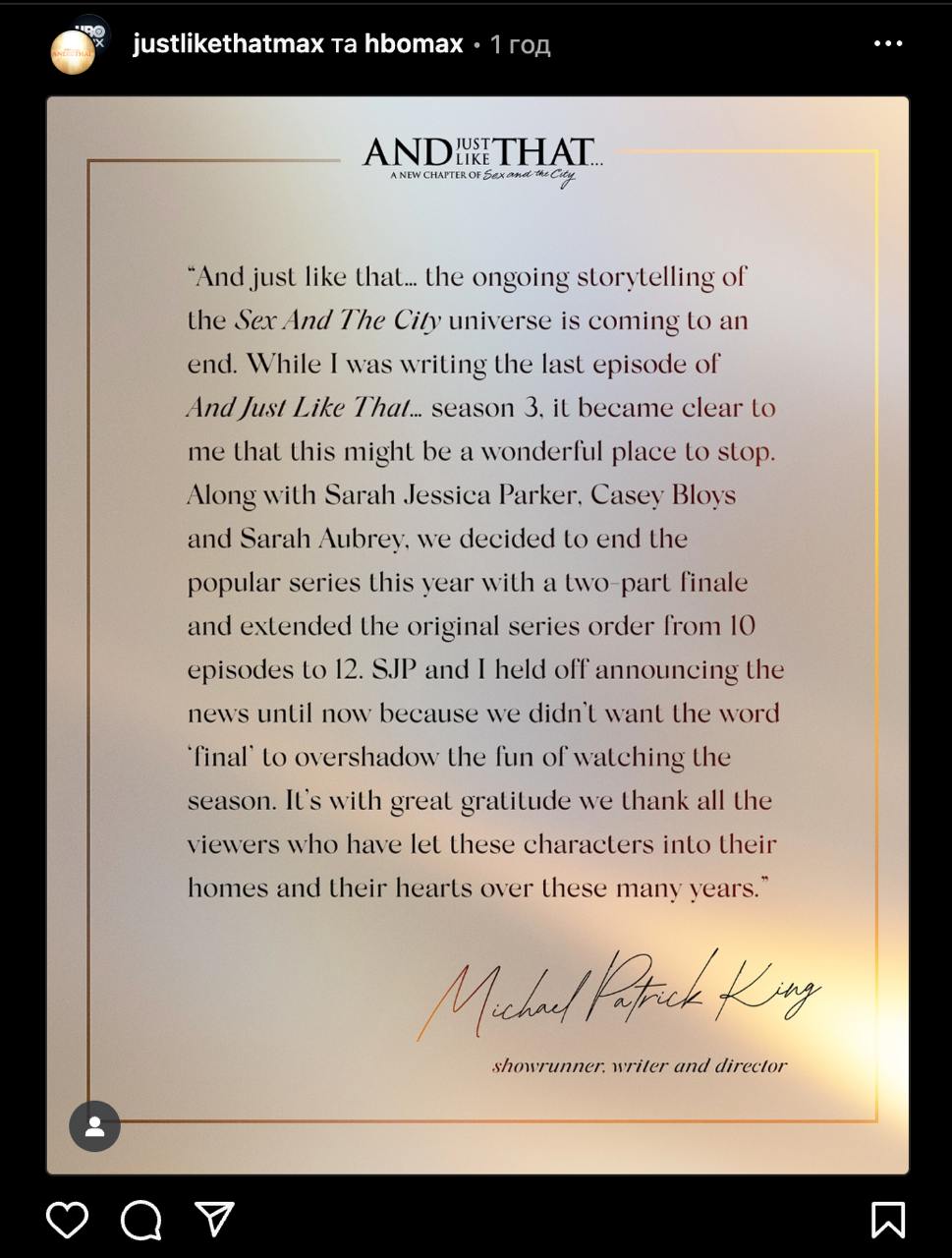 Сериал "И просто так" от создателей "Секса в большом городе" завершится на третьем сезоне. Об этом режиссер и шоураннер Майкл Патрик Кинг сообщил на официальной странице проекта.