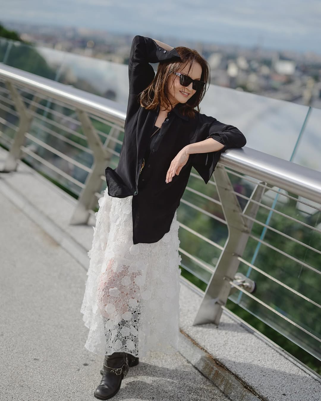 На снимках Ротару - в длинном платье молочного оттенка и солнцезащитных очках, а также в юбке от бренда своей подруги-дизайнера и крестной ее внучки – Лилии Пустовит. Она попозировала на стеклянном пешеходно-велосипедном мосту, а также прогулялась по Андреевскому спуску и сфотографировалась на фоне Андреевской церкви.