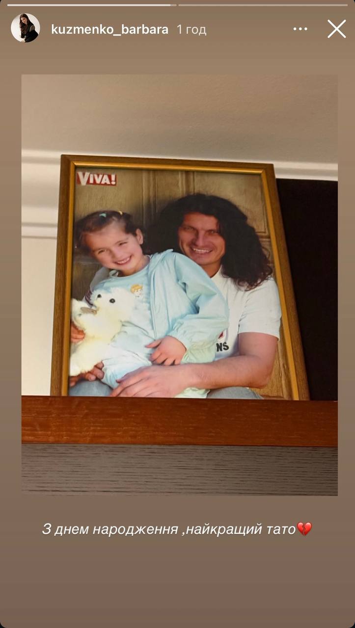 Лидеру группы "Скрябин", музыканту Андрею Кузьменко 17 августа могло бы исполниться 57 лет. По случаю особенной даты дочь артиста Барбара Кузьменко в соцсетях почтила память родного человека, опубликовав в сторис архивный кадр с отцом и трогательно обратилась к нему. На снимке Барбара запечатлена маленькой в объятиях отца во время фотосессии для страниц журнала Viva!