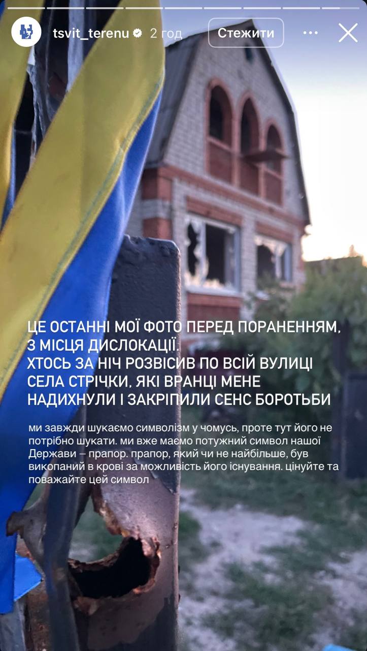 Ветеран российско-украинской войны и главный герой "Холостяк-13" Александр "Терен" в соцсетях показал кадр, который сделал перед ранением. В День флага, который отмечают в Украине 23 августа, военный выложил в Instagram снимок поврежденного обстрелами дома с выбитыми окнами, а на воротах неподалеку видно привязанную ленту в сине-желтых цветах. "Терен" отметил, что в ту ночь неизвестный развесил такие ленты по всей улице поселка.