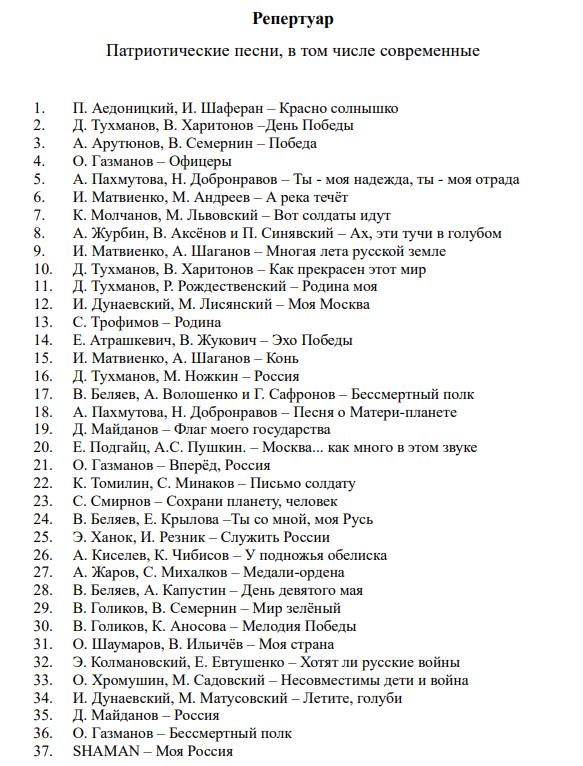 В перечень вошли также песни современных российских исполнителей, которые романтизируют "войну против Украины" и героизируют российских военных: Ярослава Дронова (Shaman), Олега Газманова, Дениса Майданова, Сергея Трофимова.