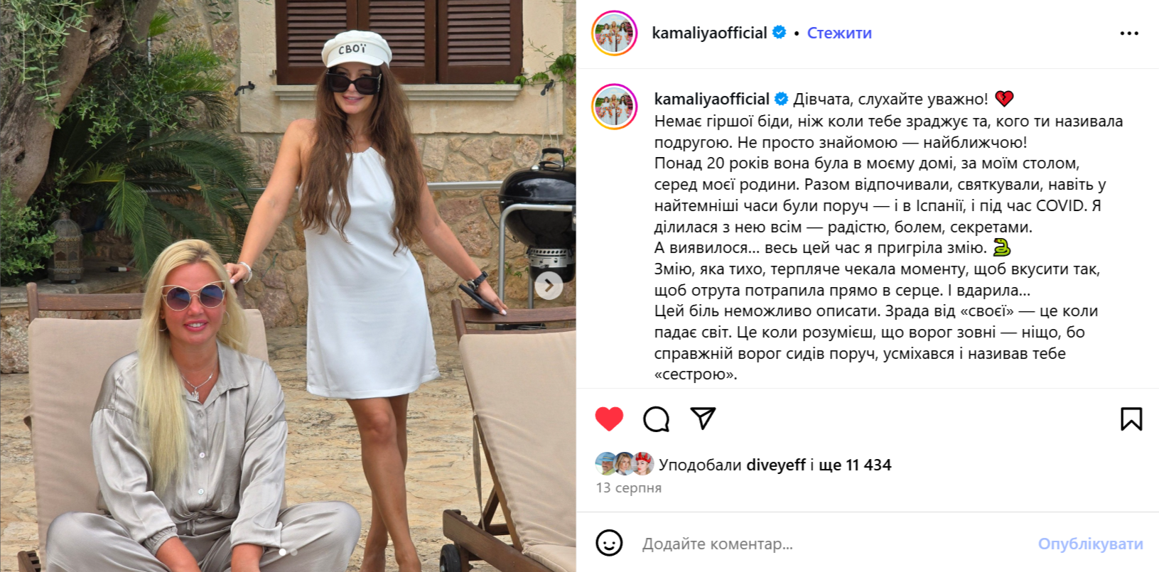 Певица Камалия несколько недель назад опубликовала пост, в котором рассказала о предательстве подруги. Она не стала вдаваться в подробности и не назвала имени женщины, с которой дружила более 20 лет, но опубликовала совместный снимок. Позже стало известно, что речь шла о бизнесвумен и владелице нескольких известных компаний в сфере шоу-бизнеса Светлане Голинской. После публичных обвинений Светлана впервые прокомментировала причины конфликта в интервью OBOZ.UA.