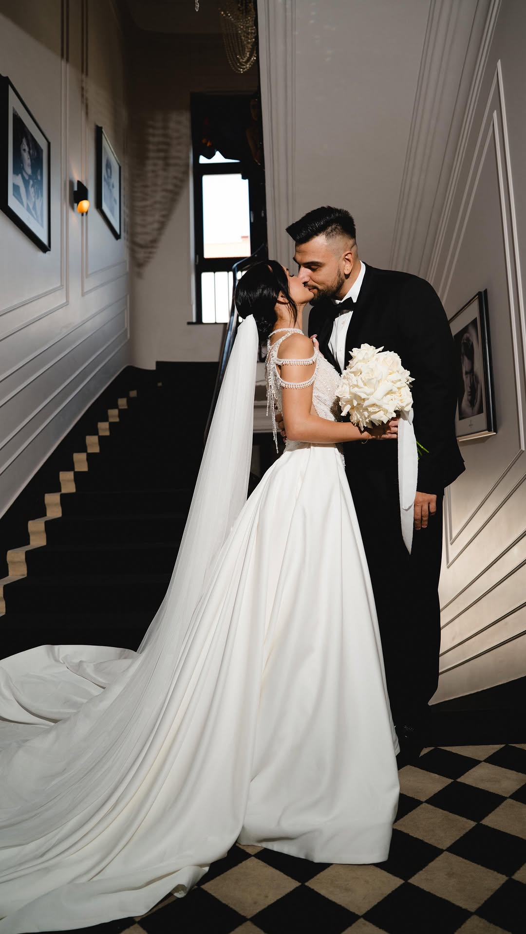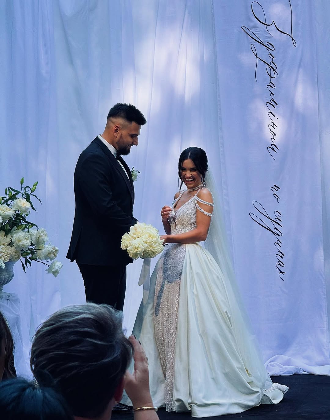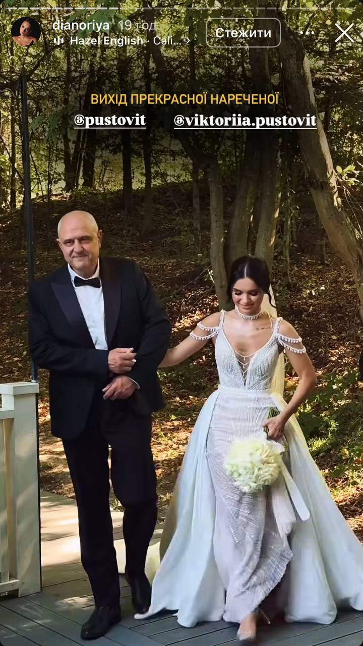 В день свадьбы Виктория примеряла два образа. Для утра невесты выбрала белый топ, мини-шорты, накидку с бабочками и длинную фату, а позже надела расшитое камнями платье со шлейфом от бренда Tanya Grig Bridal. Сам Пустовит примерял смокинг, белую рубашку и бабочку.