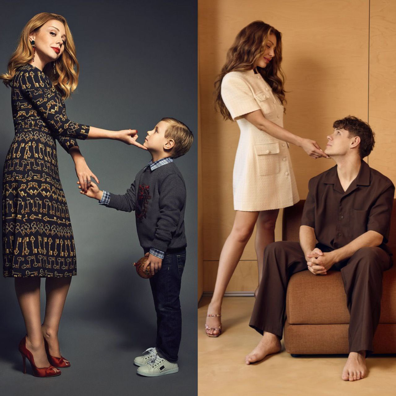 На свежем снимке семья повторила те же движения в кадре, однако позировала в новых образах. Кароль выбрала белое мини-платье с карманами и пуговицами, а ее сын - легкий коричневый костюм.