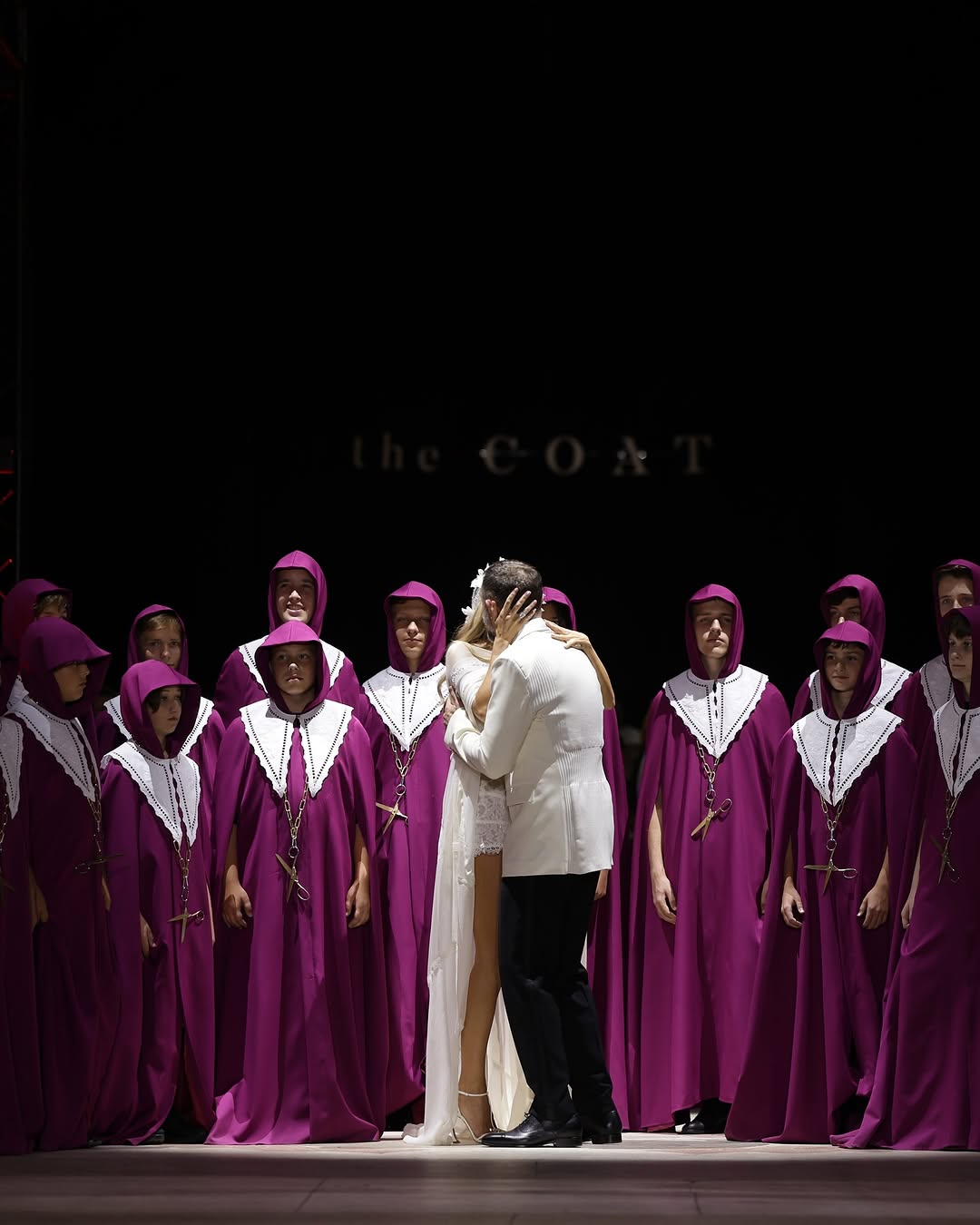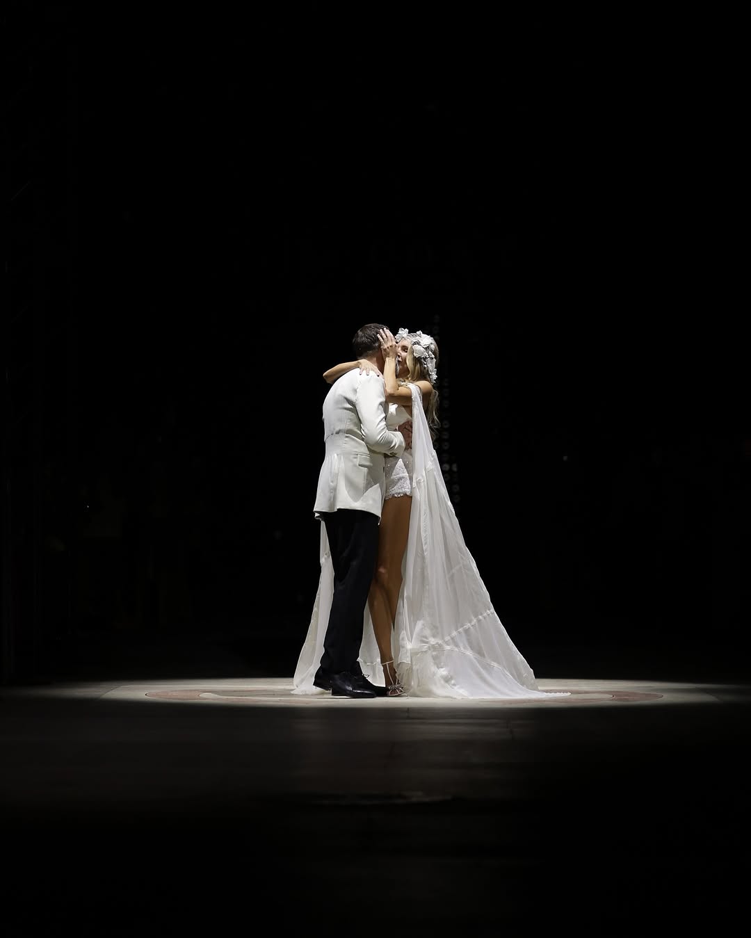 Для трогательного момента дизайнер специально обустроила импровизированный храм из лесов по центру павильона. Сильченко выбрала короткое кружевное платье-корсет белого цвета, дополненное прозрачной накидкой со шлейфом и босоножками на каблуках. Голову украшал венок с белыми цветами. Сергей Неклева появился на подиуме в черных брюках, белой рубашке и пиджаке с золотыми пуговицами.