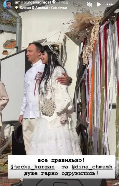 Музыкант группы "Курган & Agregat " Евгений Володченко женился на возлюбленной, харьковской художнице и поэтессе Диной Чмуж. Возлюбленные сыграли скромную свадьбу в украинском стиле. Об этом в соцсетях сообщил Амил Насиров, показав кадры с торжества.