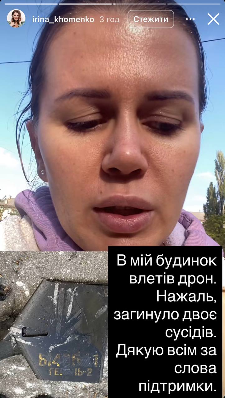 - Друзья, я бесконечно всем благодарна за слова сочувствия, за поддержку и помощь. Действительно, в мой дом попал дрон "Герань", и, к сожалению, двое моих соседей погибли, сгорели заживо. Это были люди пожилого возраста, - отметила телеведущая.