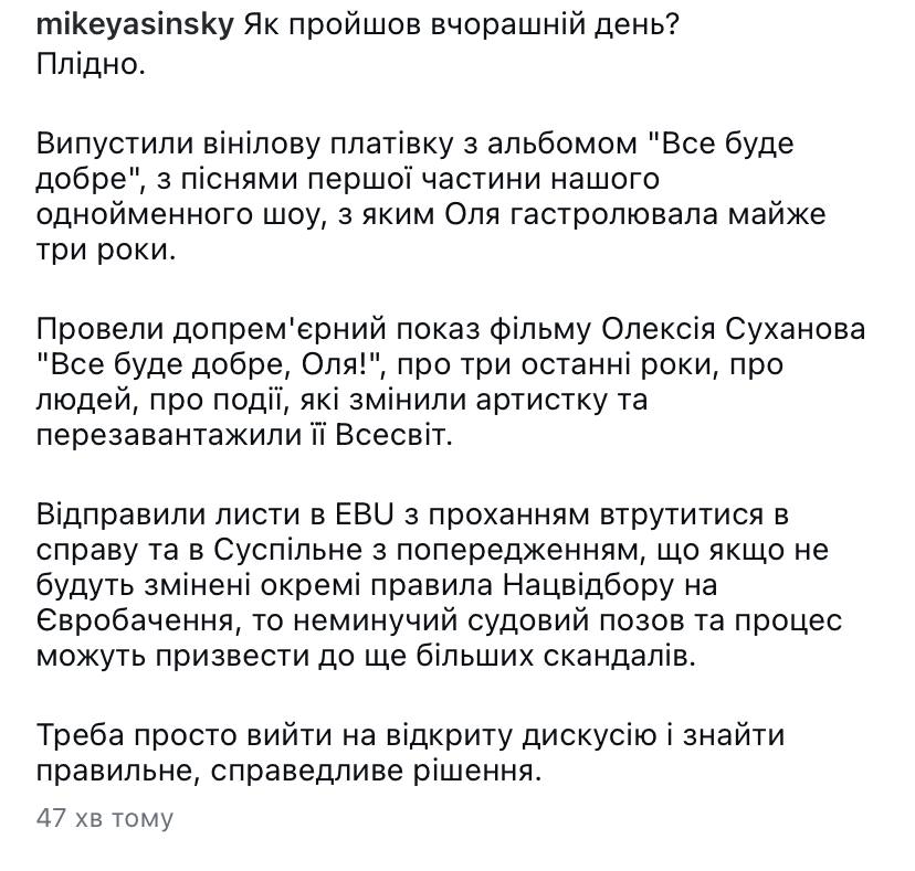 Продюсер Оли Поляковой Михаил Ясинский вместе с командой обратился к Европейскому вещательному союзу (EBU) с просьбой призвать "Суспільне" к пересмотру правил украинского нацотбора. Об этом он сообщил в соцсетях.