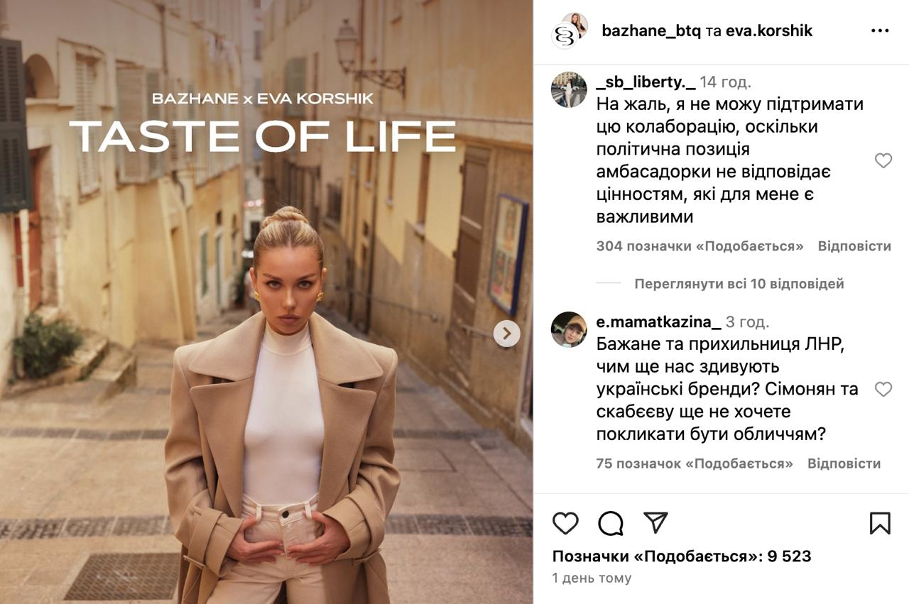 После волны хейта Bazhane удалило фото с Коршик и сняло коллекцию с продаж. Ева заявила, что некоторое время жила под влиянием российской пропаганды, а ее семья была русифицированной. Однако сейчас она всячески поддерживает Украину и развивает украинский YouTube.