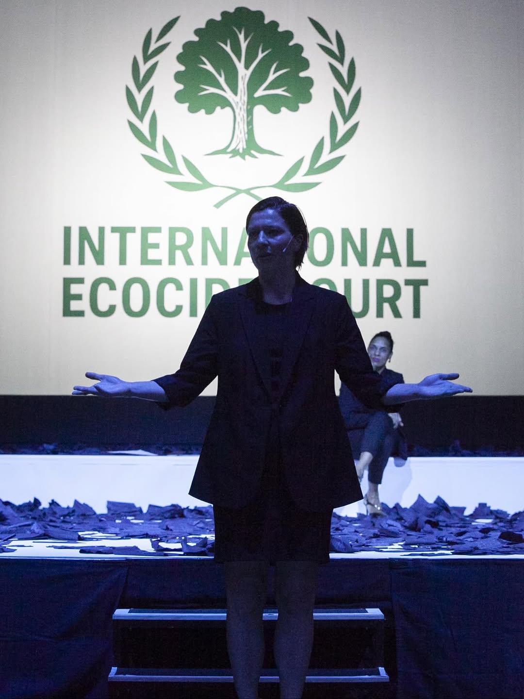 – В октябре в Германии прошла премьера вашего спектакля «Последняя конференция» (The last conference). Для читателей объясню: в спектакле речь идет о климатической конференции, которая проходит в 2050 году. Здесь действует Международный суд по вопросам экоцида, который наконец-то признал экоцид преступлением. Перед трибуналом предстают российские чиновники, ответственные за умышленное уничтожение природы в Украине. Это будто проекция будущего – что ждет преступников?