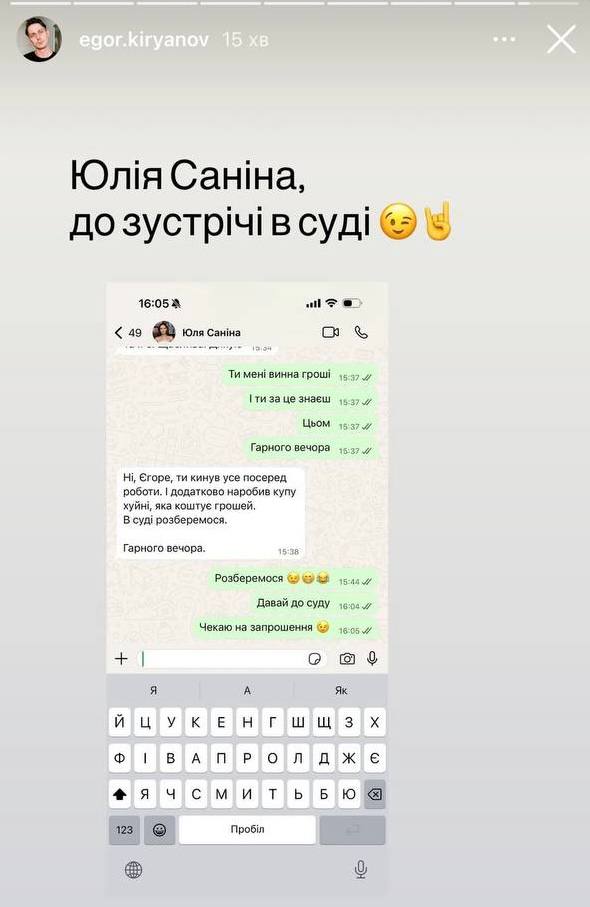 Санина добавила, что в дальнейшем общение будет происходить исключительно через юридических представителей. Кирьянов опубликовал личную переписку с Саниной, где в память о невыплаченных средствах она написала "в суде разберемся".