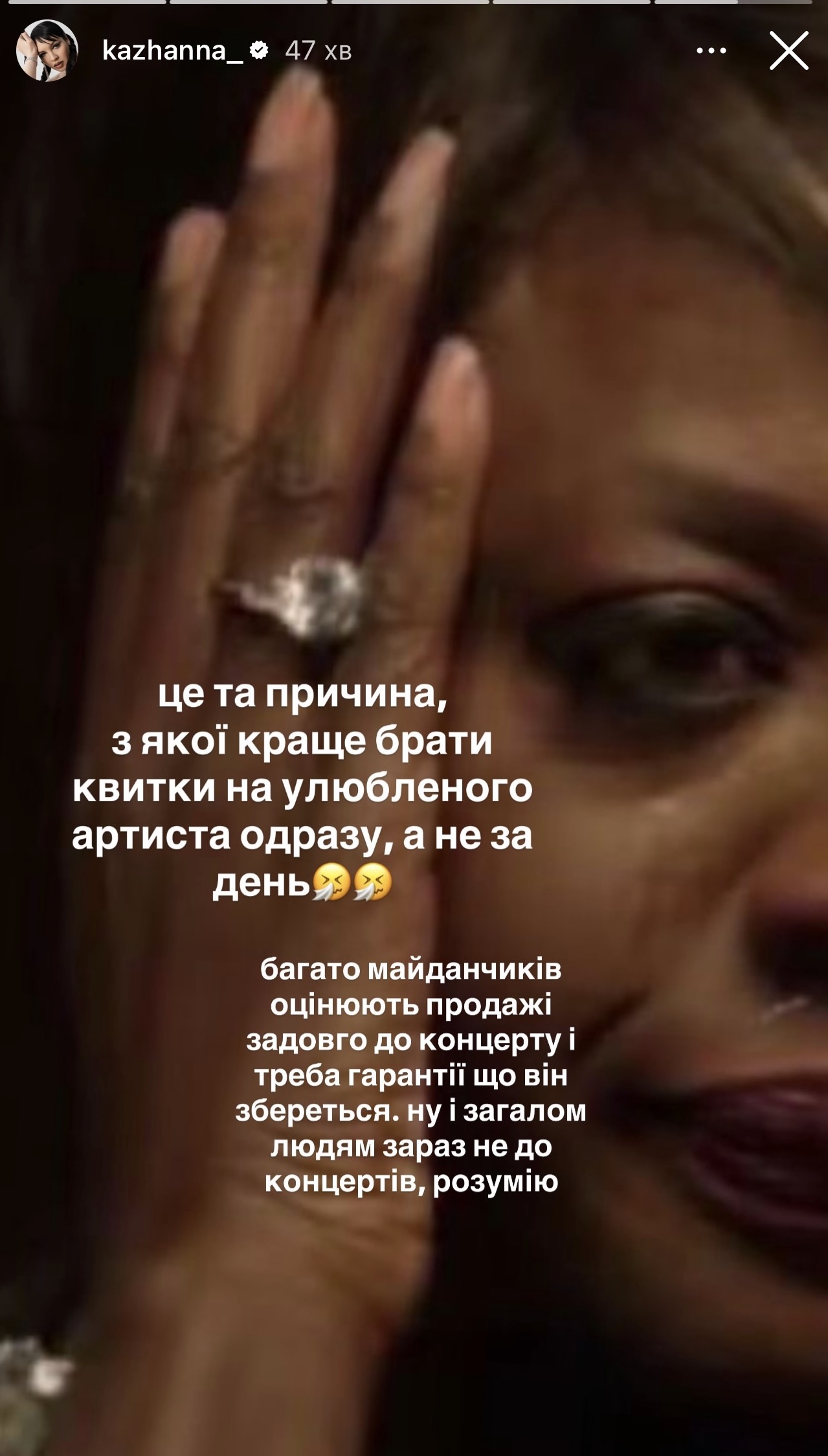 Певица Кажанна после расторжения контракта с лейблом Nova Music отменила три концерта своего первого сольного тура из-за низкой продажи билетов. Об этом она сообщила в Instagram.