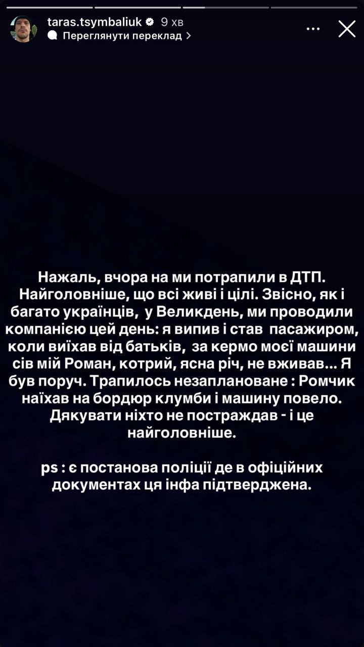 – К сожалению, вчера мы попали в ДТП. Самое главное, что все живы и целы. Конечно, как и многие украинцы, в Пасху, мы проводили компанией этот день: я выпил и стал пассажиром, когда уехал от родителей, за руль моей машины сел мой Роман, который, конечно, не употреблял... Я был рядом. Случилось незапланированное: Ромчик наехал на бордюр клумбы и машину повело. Спасибо, что никто не пострадал - и это самое главное. Есть постановление полиции, где в официальных документах эта информация подтверждена, - написал актер в сториз.