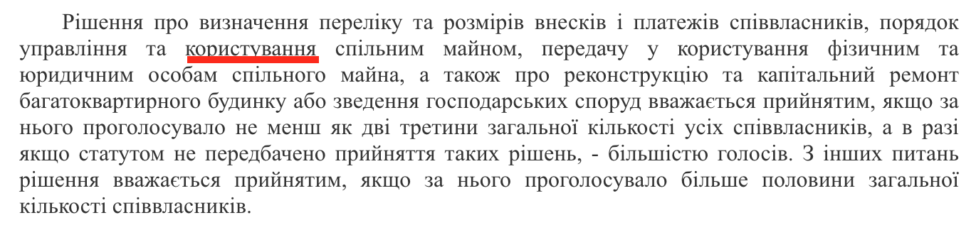 Согласно Закону «Об особенностях осуществления права собственности в многоквартирном доме» – решение о порядке пользования общим имуществом принимается на общем собрании. Скрин: zakon.rada.gov.ua