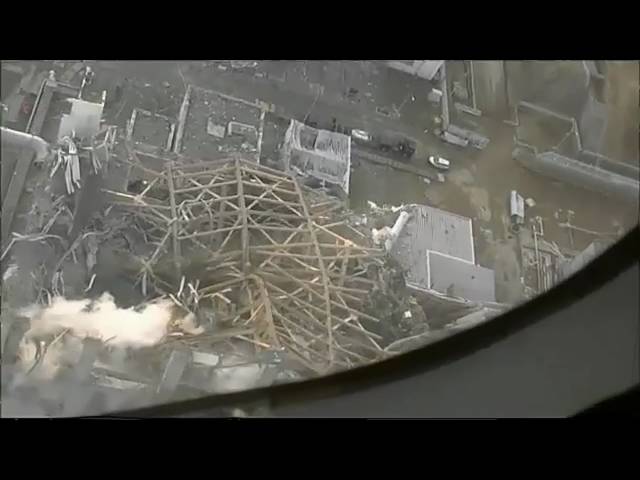 На этих кадрах видны конструкции разрушенных взрывами реакторов, из которых местами поднимаются столбы белого пара. Крыши помещений энергоблоков практически полностью разрушены, от них остались лишь каркасы.