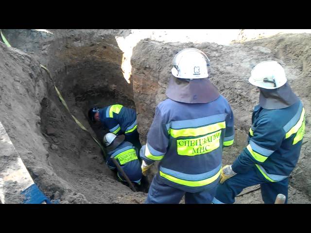 На месте работ сдвинулся грунт в траншее. Когда на место прибыли спасатели, они сразу же начали раскапывать пострадавшего.
