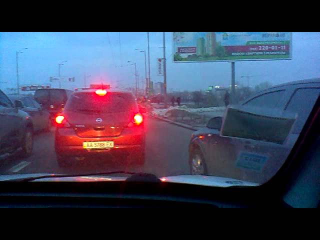 на Московском мосту произошла авария. У маршрутного автобуса, направлявшегося от Петровки в сторону Троещины, лопнуло колесо, он вылетел с дороги и перевернулся.