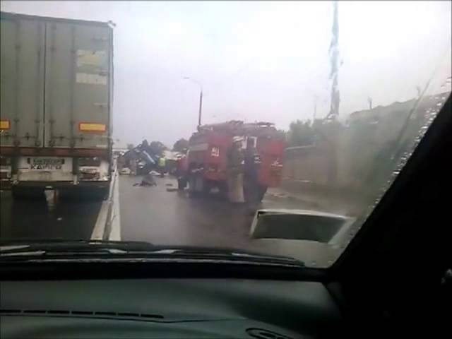 На месте работают сотрудники ГАИ. Движение по Набережной открыто, но затруднено. Тело погибшего водителя "Газели" лежит за машиной прямо в луже.