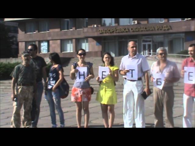 В поддержку действий местного населения райцентра Врадиевка, которые оккупировали райотдел милиции, требуя наказать виновного в изнасиловании 29-летней Ирины Крашковой, к "белому дому" Запорожья вышли неравнодушные горожане. В руках у одного из них были вилы, на них участники накололи лист с надписью "мусор". Это же слово красовалось и на мусорном ведре.