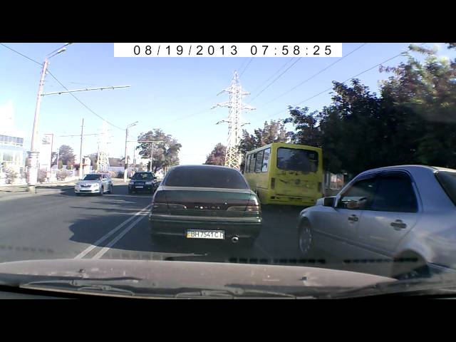 Водитель серебристого Mercedes C180 видимо решил, что его автомобиль сможет "пролезть" между машинами. В результате Mercedes зацепил машину с видеорегистратором, столкнулся с маршруткой и Nissan Maxima, после чего скрылся с места ДТП.