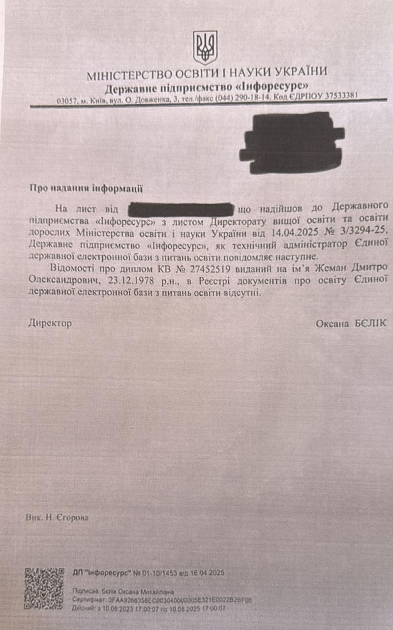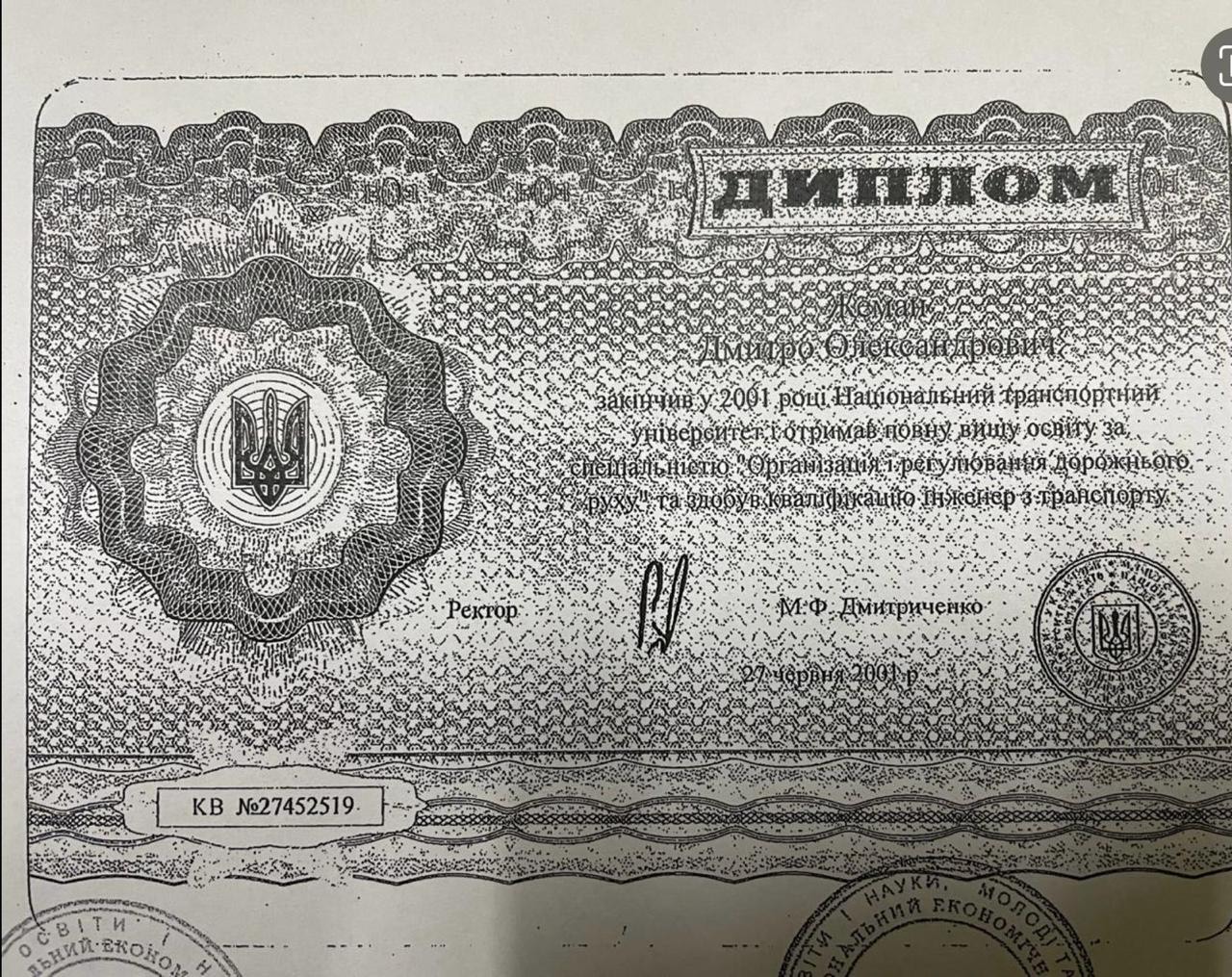 Дальше - больше: на обучение в экономический университет Жемана было зачислено на основании еще одного интересного документа - диплома специалиста КВ № 27452519 от 27.06.2001 г., выданного Национальным транспортным университетом и подписанного ректором Дмитриченко М.Ф.