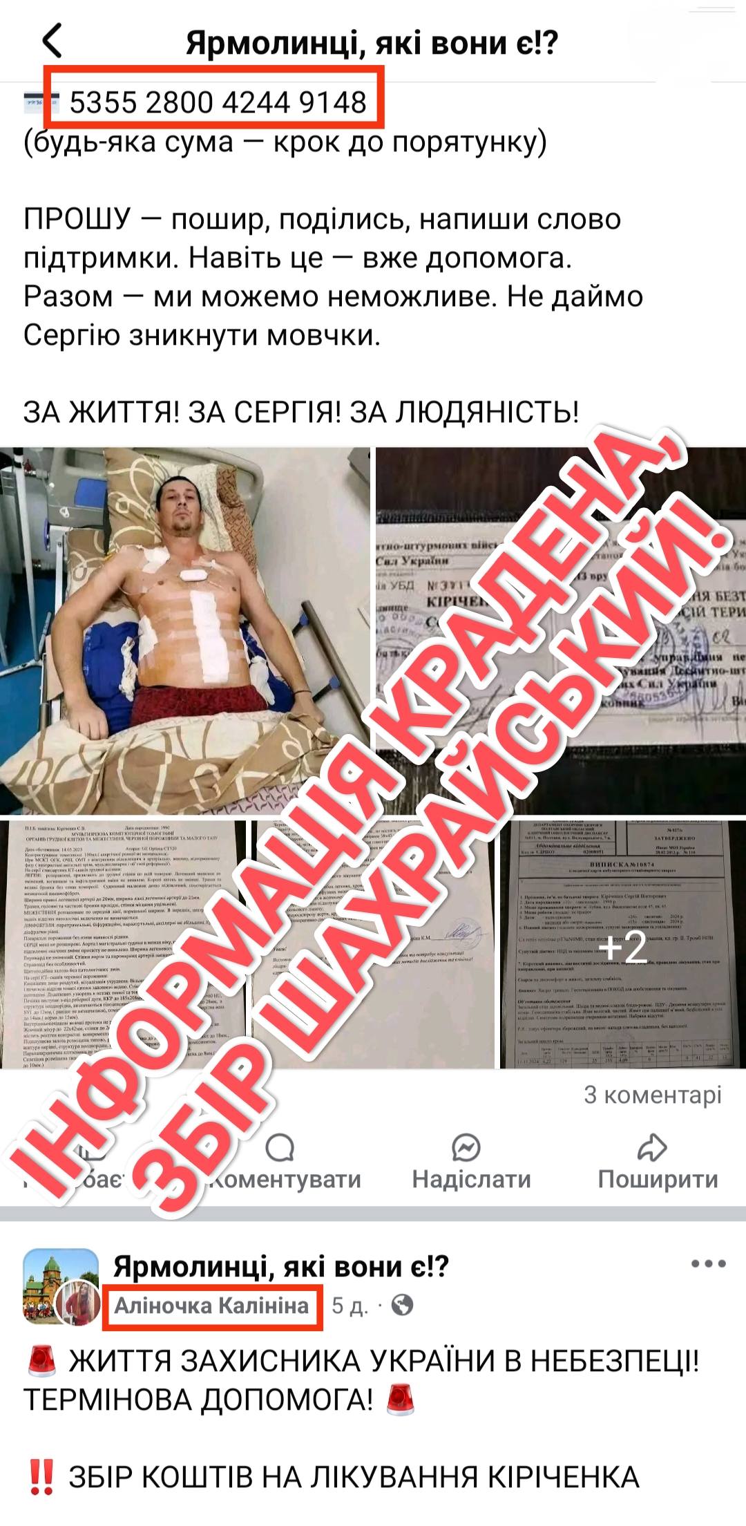 Мошенники часто играют на эмоциях добросердечных украинцев и их жалости. Скрин: «ФБ «СТОП Мошенничество! Счета фейковых сборов!»