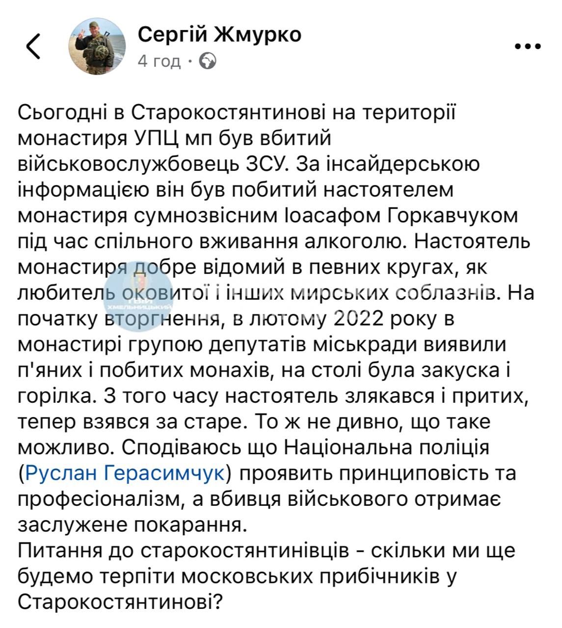 Он также заявил, что священник не отказывается от мирских удовольствий, более того - в его монастыре монахов ловили на употребление алкоголя. Сергей Жмурко публично обратился к начальнику ГУНП в Хмельницкой области Руслану Герасимчуку по этому поводу.