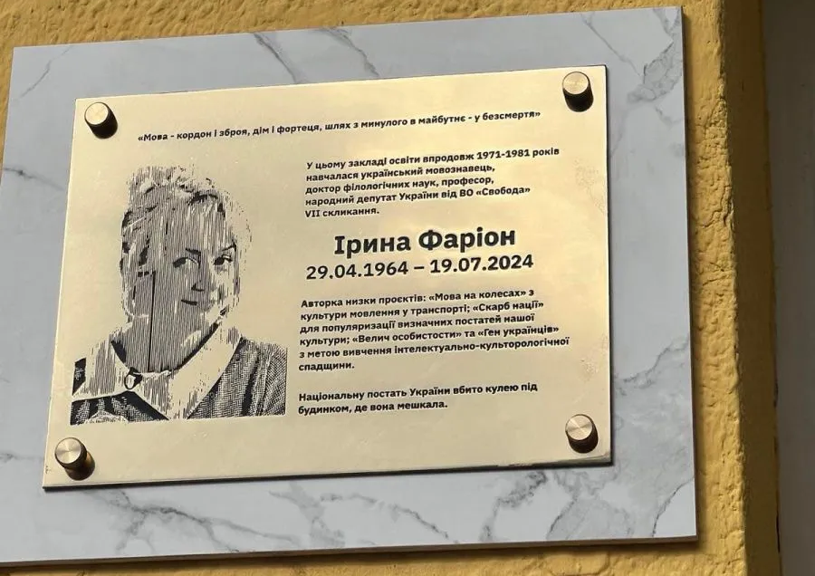 Мемориальная доска Ирине Фарион на фасаде лицея № 75 во Львове, где училась языковед. Фото: wz.lviv.ua