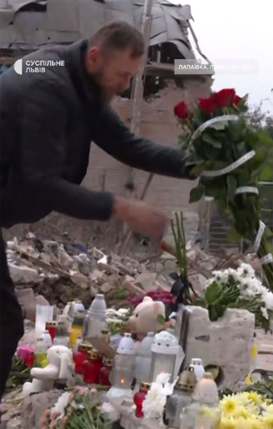Владимир возложил цветы на развалины дома, где погибла его дочь. Фото: кадр с видео t.me/suspilnelviv