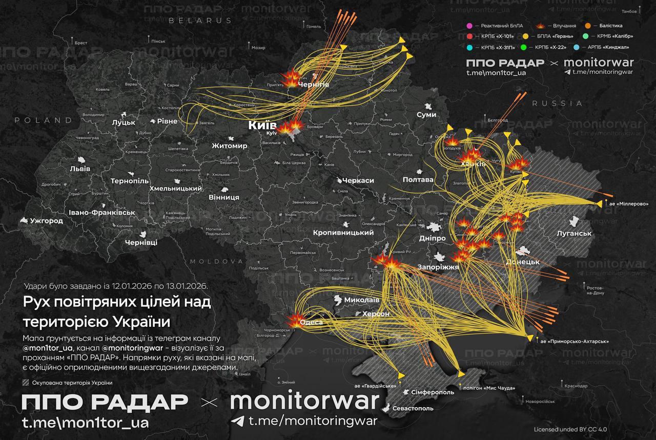 В ночь на 13 января россияне атаковали Украину 18 баллистическими "Искандерами-М" и зенитными управляемыми ракетами С-300, 7 ракетами "Искандер-К", а также 293 ударными БпЛА типа Shahed, "Гербера" и беспилотниками других типов. Как сообщили в Воздушных силах ВСУ, около 200 из запущенных россиянами дронов были "шахедами".