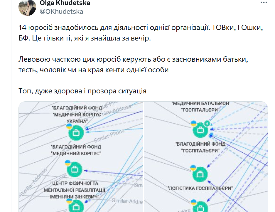 Например, найден сбор на отдельные счета, один из которых принадлежит фонду «Госпитальеров», второй – лично Яне Зинкевич (пользователями сети якобы было обнаружено еще несколько таких отдельных сборов). С последнего деньги снимались без отчета, как только набежит 10-20 тысяч. Также Худецкая написала, что с «Госпитальерами» связано не менее 14 юридических лиц разных форм собственности, и некоторые предполагают не общественную, а коммерческую деятельность. «Львиной долей этих юрлиц управляют или являются учредителями родители, тесть, муж или на край кенты одного человека», - говорится в сообщении на Х. Вдобавок журналистка обнаружила, что с сайта батальона исчезли адреса криптокошельков, на которые собирали донаты. Таким образом, без отчетности якобы было выведено около 210 тысяч долларов.