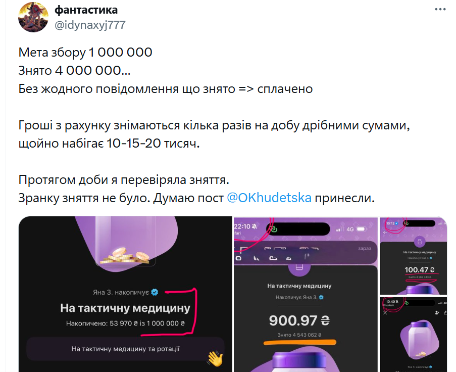 Скандал вспыхнул после сообщений в соцсети Х автора под ником «фантастика» и журналистки Ольги Худецкой. О последней известно, что она была основательницей и главной редактором Watchers – медиапроектом ОО «Лаборатория законодательных инициатив», публиковалась в других известных изданиях и является «авторкой» резонансной истории, развернувшейся вокруг пожертвований на лечение львовянина Назария Гусакова.